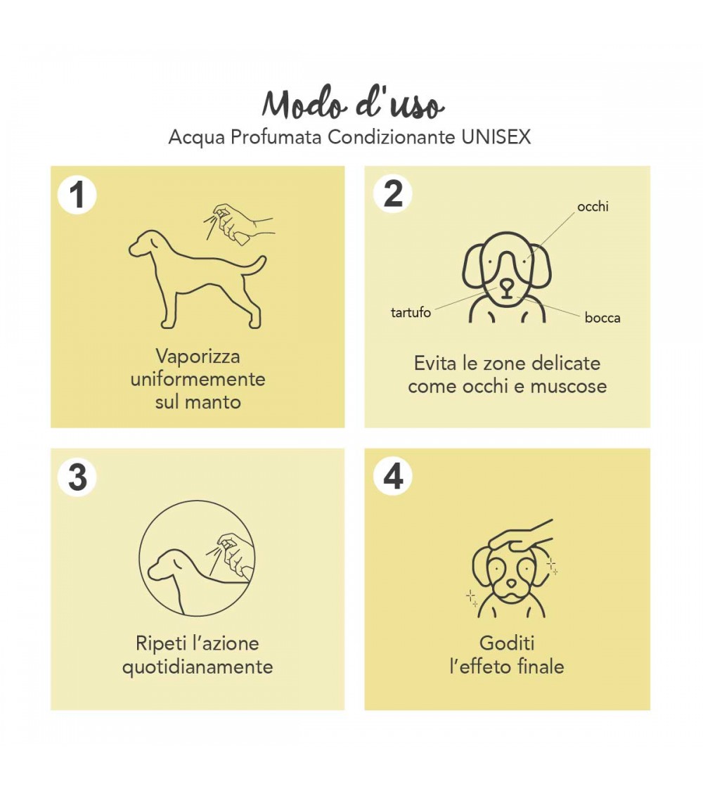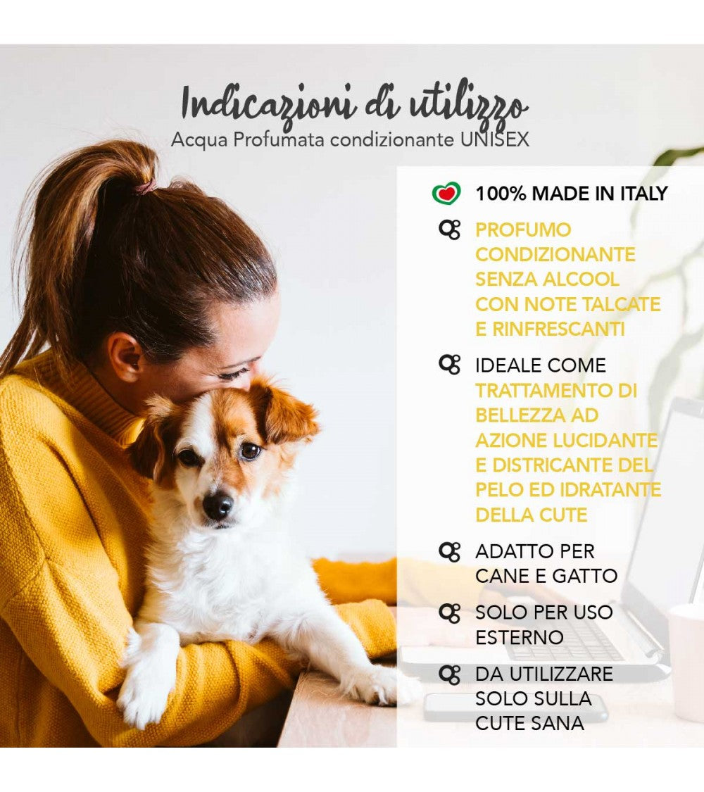 Alkoholfri plejende parfume beriget med kvaterniseret keratin til en skønhedsbehandling med en polerende og udfiltrende virkning på håret og fugtgivende på hundens hud.